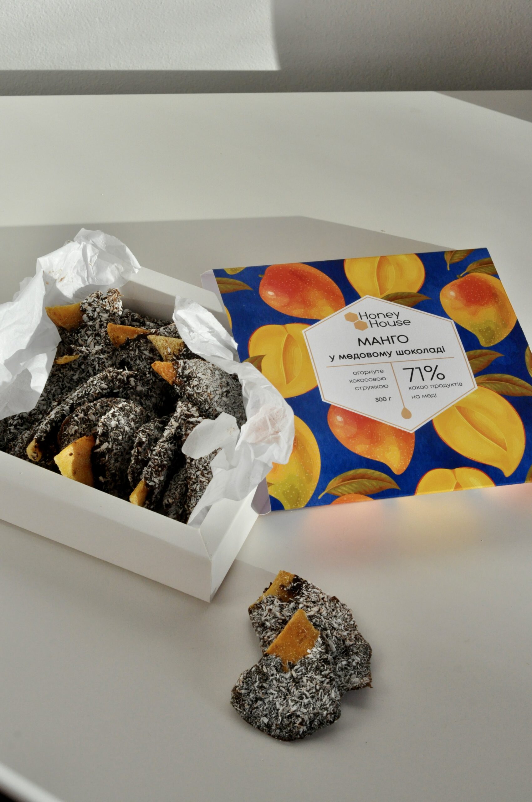 Відбірне королівське манго у шоколаді без цукру, бо цукор ми замінили на смачний та натуральний квітковий мед та посипали зверху дрібками кокосу, а ще ми порізали манго на зручні смужки, щоб було значно зручніше кусати корисні смаколики.